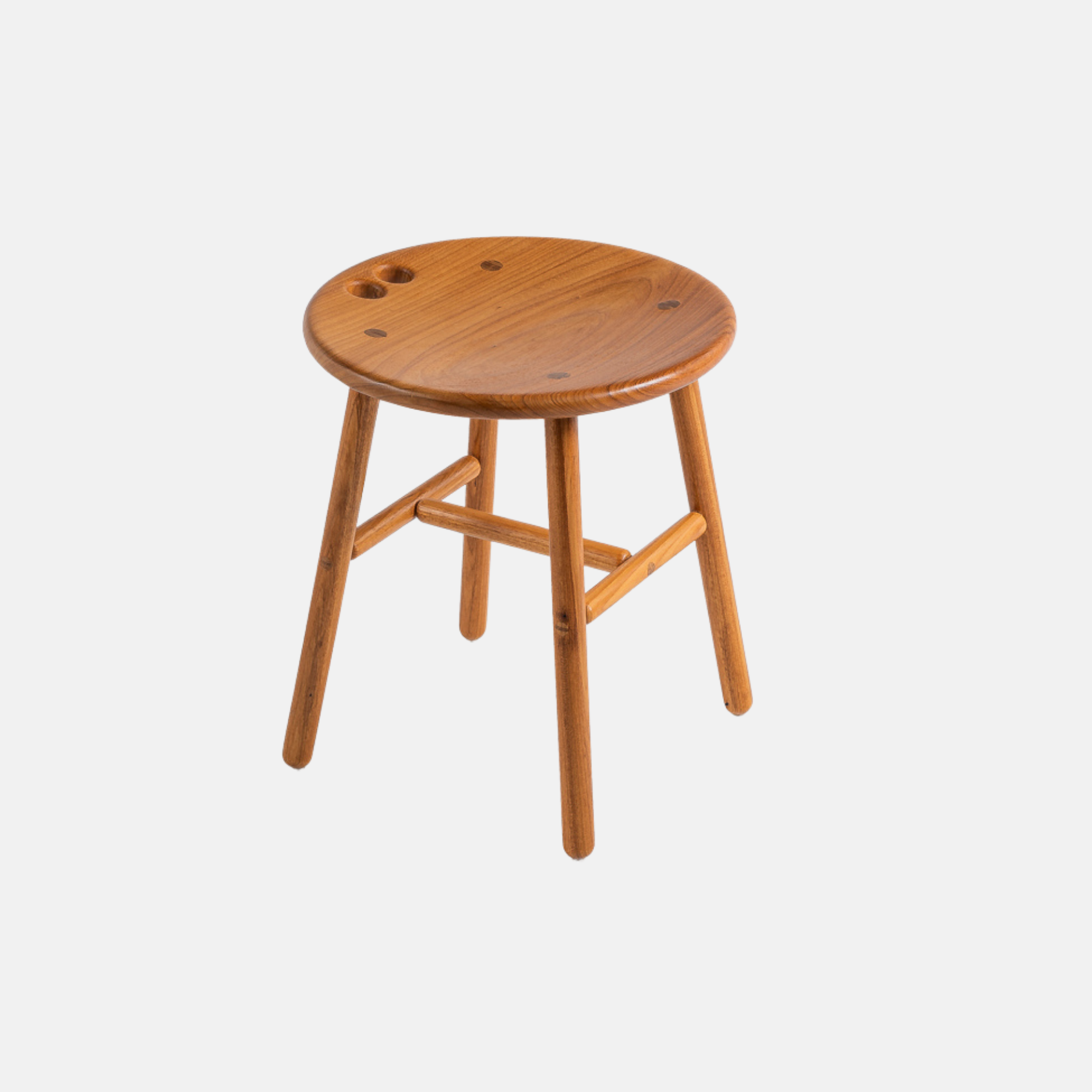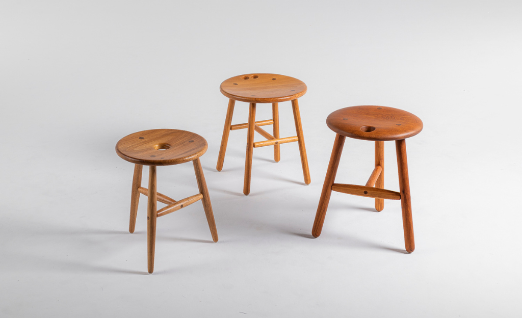 Em 2009, desenhei o banco Antonio, com três pés e todas as peças torneadas. Depois, me pediram um Antonio de quatro pés. Em vez de simplesmente acrescentar um pé ao banco existente, resolvi experimentar outro processo de fabricação. O torno cedeu lugar à tupia. Com essa mudança, mantive os pés redondos, porém retilíneos.