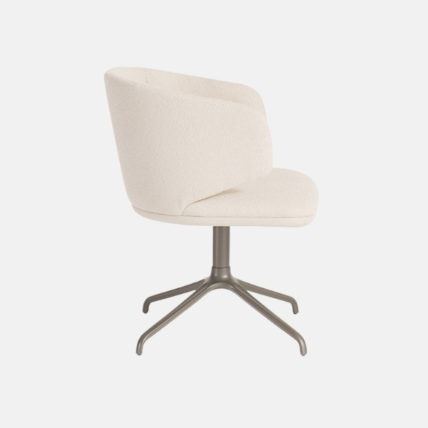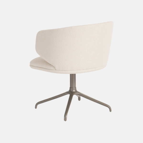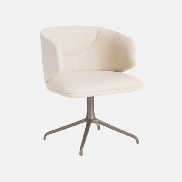 Concha e assento estofado. Detalhe inferior do assento pintado ou estofado. Base alumínio giratória pintada.