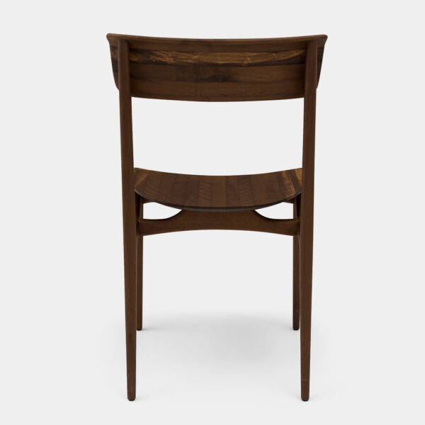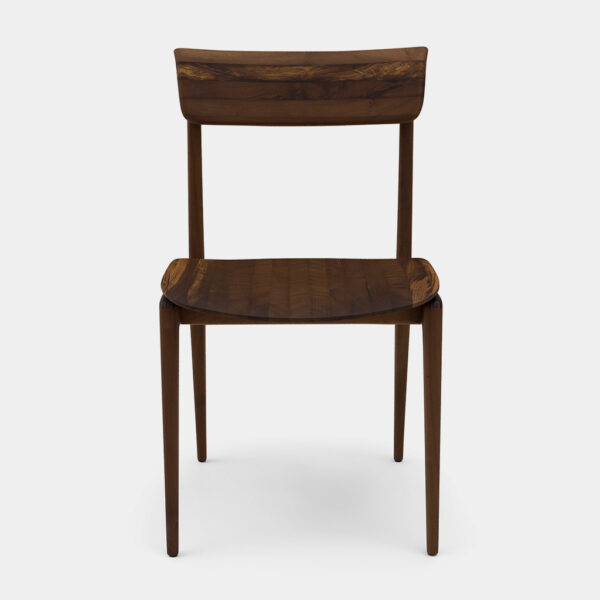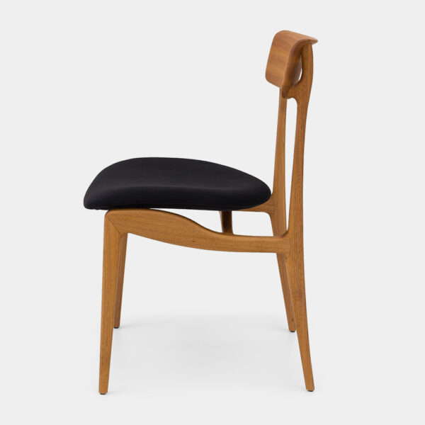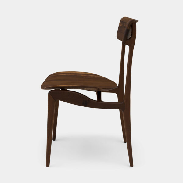É uma analogia da ramificação elegante, que se estende ao topo da cadeira oferecendo suporte ao encosto de modo discreto. Seu assento esculpido em madeira revela o trabalho artesanal em comunhão com a tecnologia.