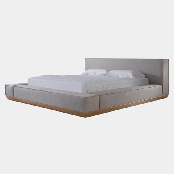 • Base em madeira Tauari cor mel, em tecidos ou couro natural