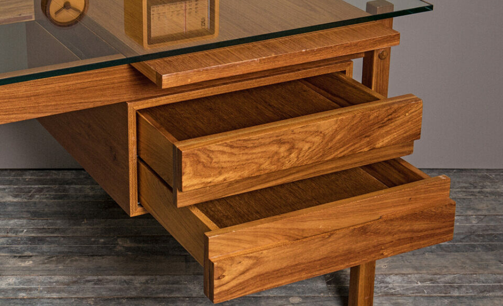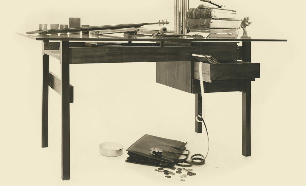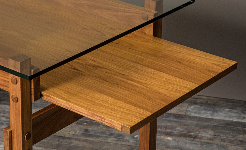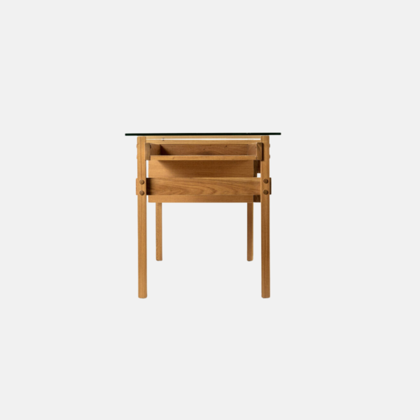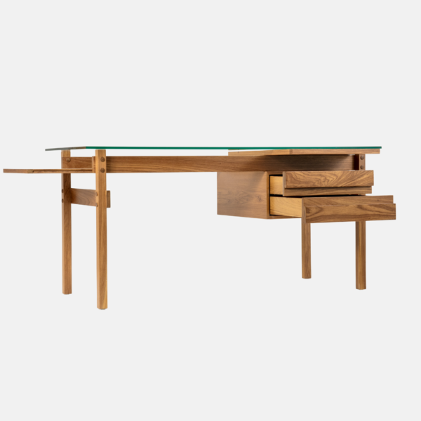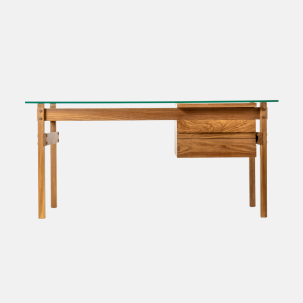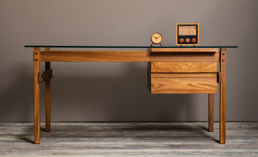 Escrivaninha criada em homenagem ao amigo de Sergio Rodrigues e Vera Beatriz Rodrigues, o governador do Estado da Guanabara, Carlos Lacerda. São duas gavetas e dois planos corrediços numa estrutura ortogonal com botões que evidenciam os encaixes. Se na época em que foi criada o plano corrediço central da escrivaninha era o espaço perfeito para uma máquina de escrever portátil, hoje esse espaço pode guardar um notebook ou um tablet. Já o plano lateral sobre as gavetas apoia uma xícara de café, ou acomoda fotografias, imagens.