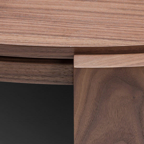 De formato robusto, a Clock central se apresenta de forma imponente ao ambiente. A tríade de pés em lâmina natural complementa de maneira harmoniosa seu grande tampo redondo, que parece flutuar sobre a estrutura.