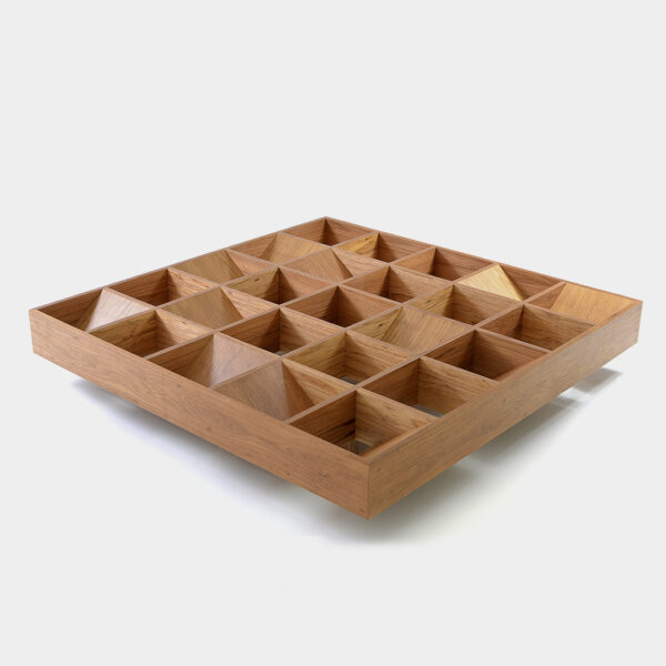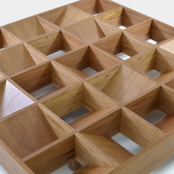 São muito importantes e ainda bastante presentes na nossa arquitetura. O tampo em vidro incolor permite a visão do jogo de sombras, cheios e vazios resultantes do arranjo não linear de um mesmo módulo. Dessa maneira a mesa adquire aspectos diferentes conforme a iluminação do ambiente ou o ângulo de onde se é observada.