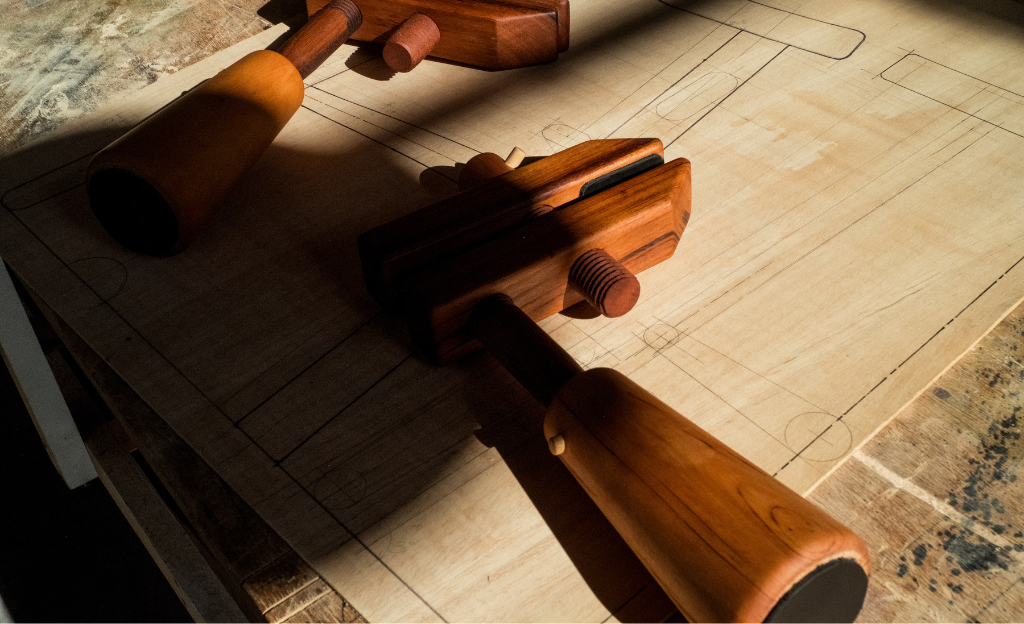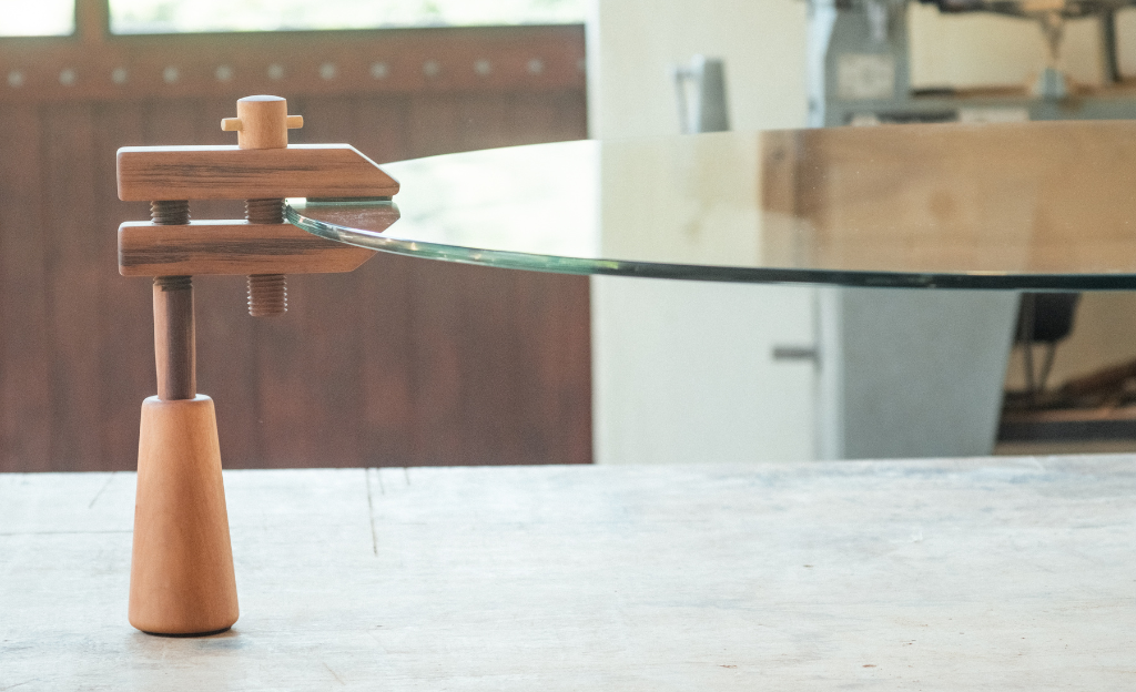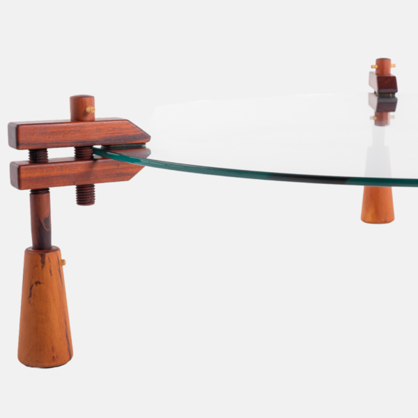 Estilo + criatividade = mesa Grampo, peça singular criada em 2013 por Fernando Mendes. Ela faz parte de uma coleção de peças de mobiliário inspiradas em utensílios de marcenaria. Neste projeto, os grampos, ou sargentos, são instalados num tampo de vidro e assumem a função dos pés da mesa. Os grampos são feitos de madeira muiracatiara, em um trabalho primoroso de marcenaria. Para tampos redondos ou triangulares são usados três grampos, para tampos quadrados ou retangulares, quatro grampos. A conveniência desta mesa é que sua montagem é extremamente simples.