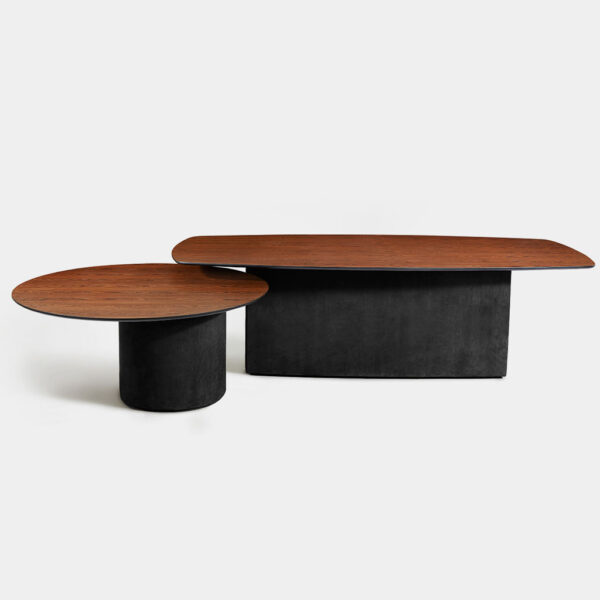Base folheada em madeira natural ou ebanizada, laca, pedra ou revestido em couro. Tampo folheado em madeira natural, laca, vidro ou pedra natural