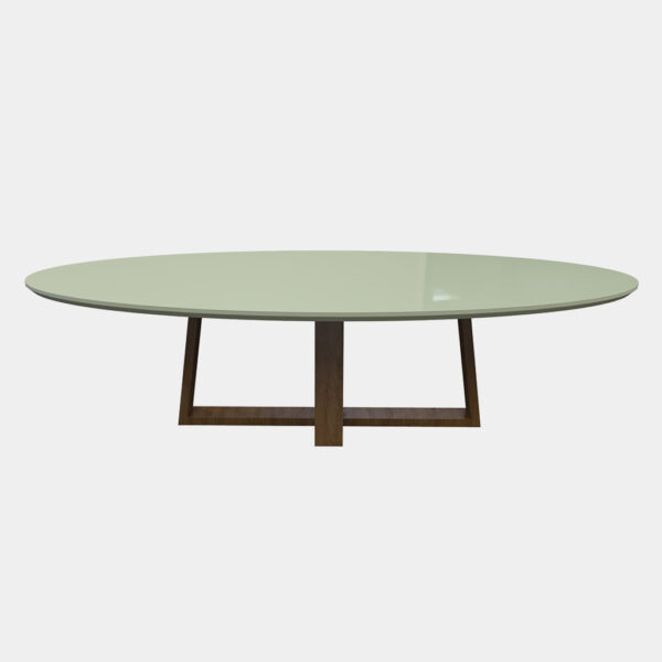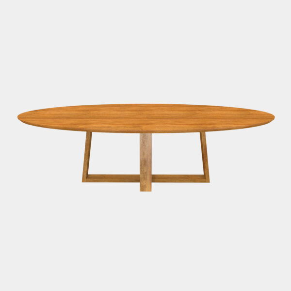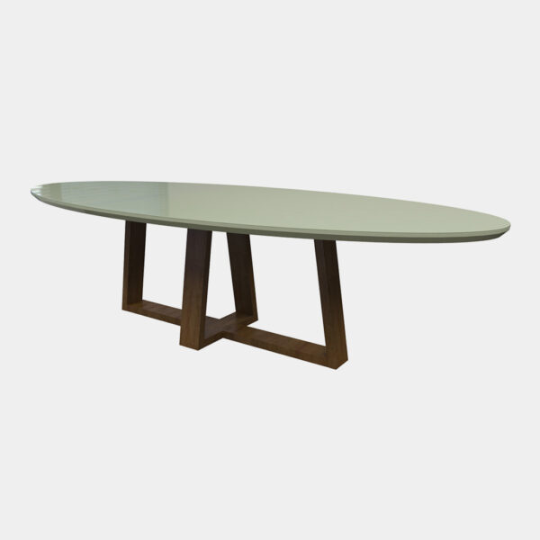 Com tampo oval e delgado, projetado para o máximo aproveitamento vertical, a mesa de jantar Medina tem base em madeira maciça com inclinações específicas que conferem ao modelo originalidade.
