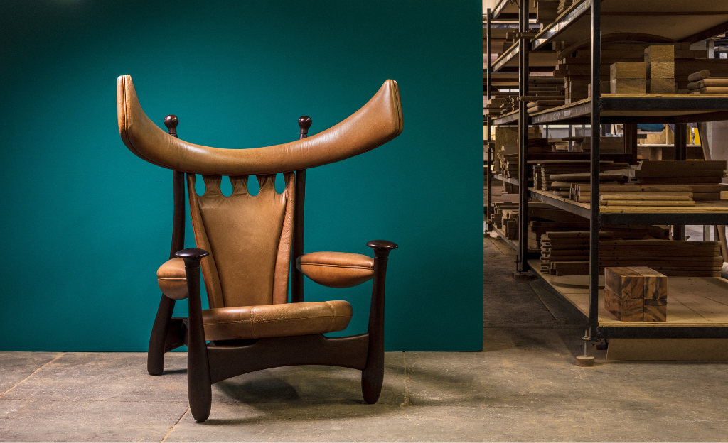 “Na época, me interessava muito mostrar a qualidade dos artesãos da Oca. Então imaginei fazer algo como o caso da costura dos elementos de couro, com o foco em mostrar a qualidade. E imaginei a cadeira Aspas. A cadeira teria certos detalhes lúdicos ou então detalhes que tinham uma relação longínqua com móveis de estilo e uma certa brincadeira, que já era a minha paixão pelos vikings de ter um chifre daquele jeito.