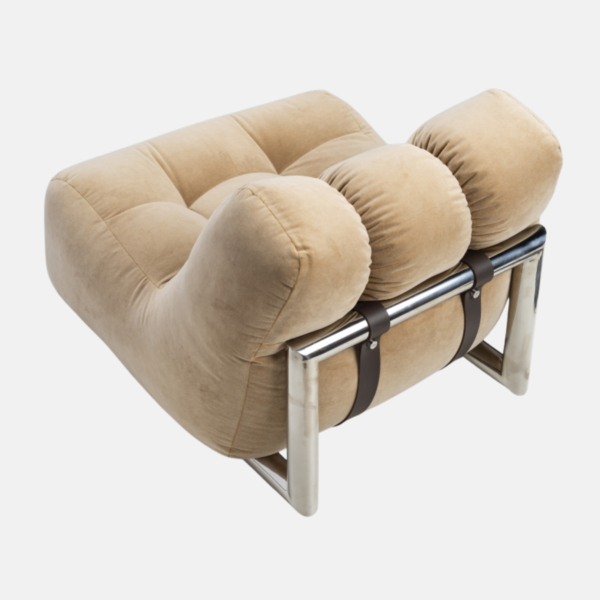 Inspirada na irreverência dos movimentos de design Modernista e Midcentury, a Poltrona Horizonte emana conforto e personalidade. Suas formas arredondadas e proporções generosas evocam o espírito criativo dos anos 60, reinterpretado com um olhar contemporâneo. A estrutura em inox polido cria um contraste elegante com os puxões do estofado. Bótons personalizados com a marca adicionam um toque de exclusividade, enquanto as tiras em couro sustentam o assento com leveza e sofisticação. Ideal para ambientes descolados, a peça convida ao relaxamento. Seu visual icônico funciona como ponto focal em composições que equilibram funcionalidade e expressão