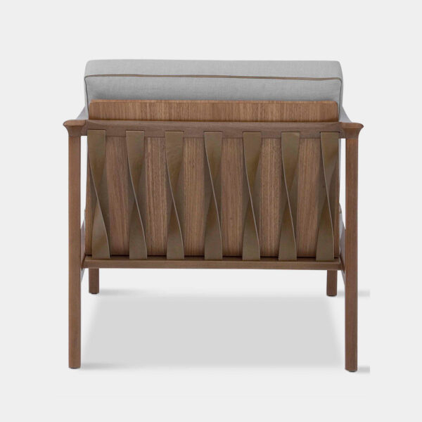 A poltrona Olivia surpreende o olhar em todos seus ângulos: as tiras grossas de couro retorcidas compõem o espaldar de madeira maciça assim como a estrutura da peça.