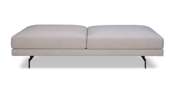 Seus pés metálicos discretos sustentam a estrutura com leveza, quase como se o sofá estivesse flutuando no espaço.